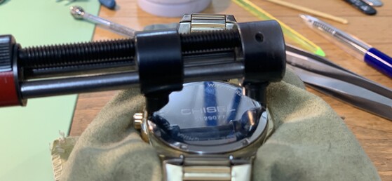 On this watch the back is threaded, and screws onto the case. I mount the watch in a dedicated case vice to securely hold it while I unscrew the back with a Swiss case-back tool. I have a few different models for different case type, and also different size case vices. The cloth is to prevent accidental damage to the case, and it helps prevent slippage.