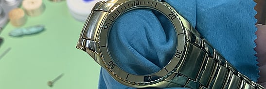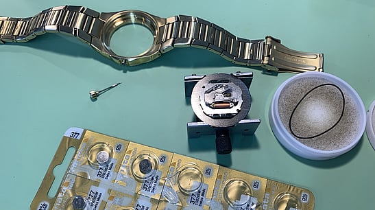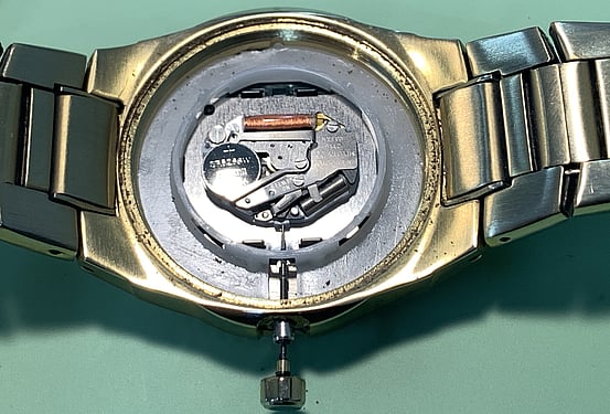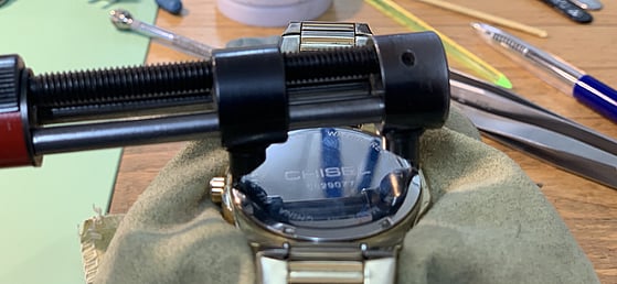 With the new battery, and the stem and crown installed, the case back is re-fitted and the watch is pressure tested in a Swiss automatic air pressure tester.