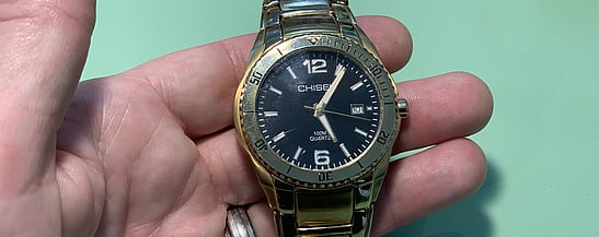 This watch has stopped, so my basic assumption is that the battery is due for replacement. It has a water resistance rating of 100m, so I will also check the seals and pressure test the watch afterwards.
